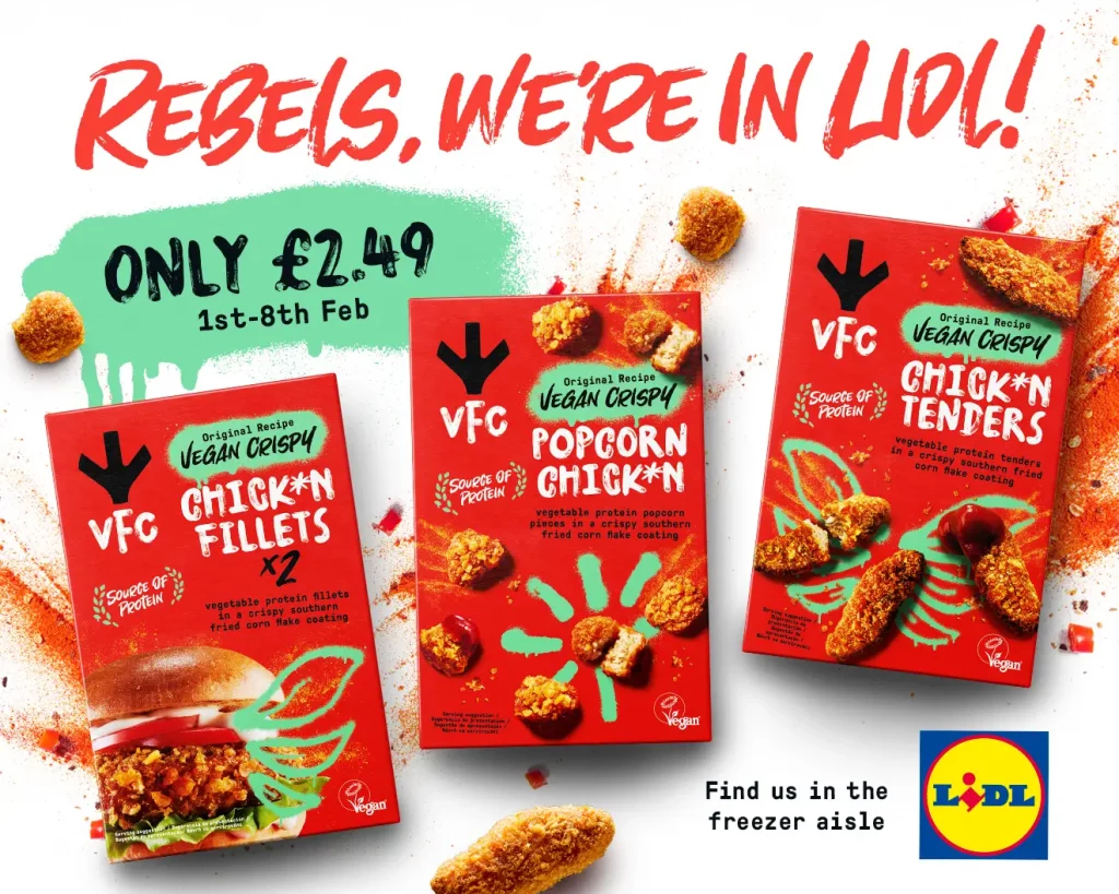 Our Vegan Fried Chick*n is gracing the freezer section of Lidl stores across the UK for one week only. You heard us right. This is a middle aisle-style, limited-time-only, scarcity-marketing, FOMO kind of situation.